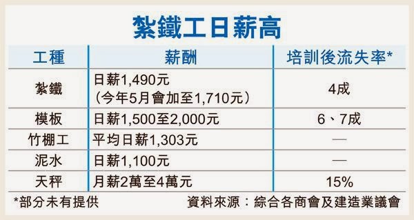 經濟日報 - 多項工程相繼上馬,市場需求大量紮鐵工,加上政府加推公屋,業界料未來3、4年工人不愁出路,日薪有望升破二千元。